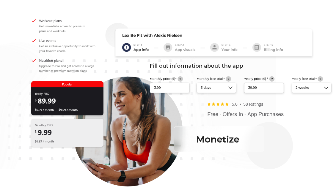 Transform your content into a scalable subscription business. With your branded fitness app you can define pricing plans for your content and all the payments are made within your app.